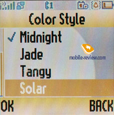Настройки. Аппарат не может порадовать разнообразием настроек, но некоторые вещи стоят упоминания; стандартно можно выбрать обои экрана, цвет меню, хранитель экрана. Заменой профилям являются Стили звонка, они привычны по другим продуктам от Motorola. Есть функция автоматического отключения телефона по расписанию.