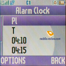 Будильник. Вы можете создать несколько будильников, для каждого выбирается своя мелодия из общего списка, есть возможность установить повторы (один день, ежедневно, только рабочие дни); виброзвонок может также быть отключен. Каждый будильник получает свое имя. Будильники могут работать и при отключенном аппарате.