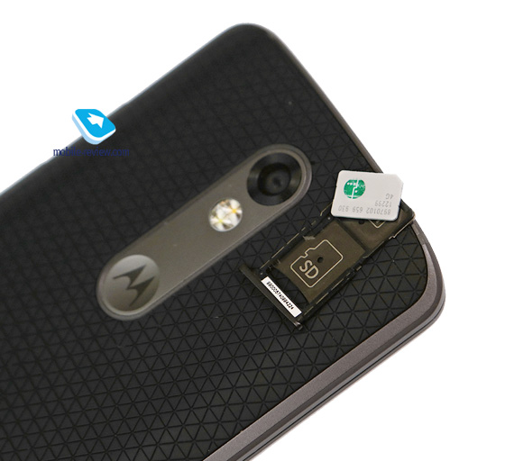 В телефоне пять микрофонов (против двух в Moto X Play), они составляют вместе систему шумоподавления, которая является одной из лучших на рынке, аппарат отлично отфильтровывает ваш голос даже в самых шумных условиях, на него стоит обратить внимание всем, кому приходится разговаривать на ветру, под шум отбойного молотка или в иных неблагоприятных условиях. На верхнем торце можно видеть 3.5 мм разъем для наушников, а рядом – слот для SIM-карт и карты памяти. Конструкция держателя достаточно любопытна: с одной стороны вы можете вставить одну или две SIM-карты (в Droid Turbo 2 в слоте место только для одной карты), с другой стороны – карточку памяти. То, что появились карты памяти, можно считать прогрессом.