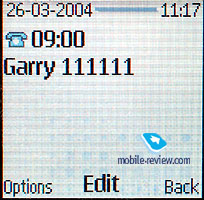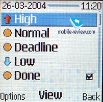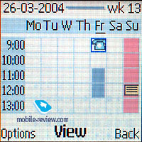 ![]() ![]() Organizer. You may keep from 50 to 100 entries in the memory and everything depends on their length, there is an automatic erasing of the old entries (by the time characteristic). There is a month and week view of the calendar, the last view has a division into hours, there is a quick switch to an entered date. There is a possibility to enter up to 5 different events (meeting, call, birthday, reminder, memo). A notification may be assigned to an event, they may be recurrent.