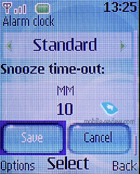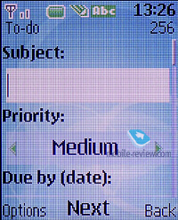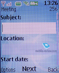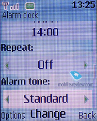 Органайзер. В телефоне имеется один будильник, он может работать как ежедневно, так и по выбранным дням недели. Для него можно выбрать сигнал и назначить время повтора. Календарь. Возможен просмотр как за месяц, так и за неделю с разбивкой по часам. Кроме этого, можно просмотреть список всех событий. Для события можно выбрать тип (встреча, звонок, день рождения, заметка, напомнить), записать тему (до 160 символов), место (до 50 символов), дату и время начала и окончания. Также для события можно выбрать звуковой сигнал оповещения и время предварительного напоминания.