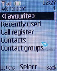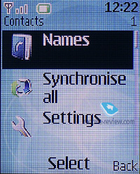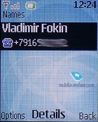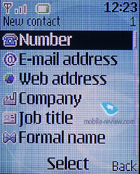 В аппарате всего около 16 Мб памяти, динамически распределяемой между приложениями, из которых пользователю доступно около 10-11 Мб. Для комфортной работы с текстом в телефоне имеется предикативная система ввода текста Т9 для русского и английского языка. Локализация аппарата выполнена хорошо, сокращения встречаются редко. Телефонная книга. В телефонной книге может храниться до 1000 контактов, но количество может варьировать в меньшую сторону, все зависит от того, сколько информации записано на один контакт. Для одного контакта можно записать имя и фамилию, до 5 телефонных номеров с выбором типа номера для каждого из них, до 3 адресов электронной почты, адрес web-страницы, название организации, должность, официальное имя, псевдоним и почтовый адрес. Кроме этого, для контакта возможно записать дату рождения, небольшую текстовую заметку, а также присвоить картинку/фотографию. Контакт можно поместить в одну из групп, созданных пользователем, для группы возможно задать не только имя, но и присвоить картинку/фото, а также мелодию вызова. В телефоне имеется быстрый набор до 8 номеров. Контакты можно перемещать с SIM-карты в телефонную книгу и обратно. Поиск в телефонной книге осуществляется по первым буквам имени. Контакты в списке могут отображаться только в виде имени и фамилии, имени и фамилии с номером мобильного телефона или же имя и фамилия, а также небольшая миниатюра присвоенной картинки.