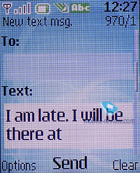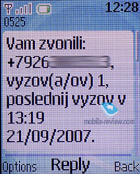 Фотография, присвоенная контакту, отображается при исходящем вызове, пропущенном вызове и входящем сообщении в маленьком окне. Но вот при входящем вызове фото отображается практически на полный экран, только сверху и снизу имеются небольшие отступы. Сообщения. Работа с исходящими SMS- и MMS-сообщениями возможна сразу на одном экране, сообщение формируется исходя из использованных данных. В нижней части экрана отображаются иконки, посредством которых можно выбрать контент, который будет размещен в сообщении. Такой подход облегчает работу с сообщениями, а в частности с MMS-сообщением. Из входящего сообщения пользователь вправе изымать данные, размещенные в нем, будь то номер телефона, адрес электронной почты или web-страницы, для последующего использования в телефоне. Аппарат поддерживает мультирассылку сообщений, контакты помещаются в одно поле через точку с запятой. Кроме этого, аппарат поддерживает flash-сообщения, когда текст сообщения будет выводиться сразу на экране телефона получателя. Есть и звуковые сообщения, вам предлагается надиктовать сообщение через диктофон, продолжительностью не более 1 минуты, и отправить данную запись по MMS. В телефоне имеются шаблоны сообщения, также возможно составлять собственные шаблоны.