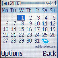 Alarm. The alarm can be found in the main menu. It has no extra settings, only single operation. This function is realized poorly. Gallery. All graphic and sound files are kept in this menu. There are also settings for the access to download new files (wap). One can create own folders here. Organizer. This feature is realized as in the other phone from Nokia, for example in the Nokia 6610. You can add from 100 up to 500 notes, it depends on their length. An automatic deletion of the old notes is available (on the basis of time). The calendar has a monthly view and you can quickly find a desired date. ![]()