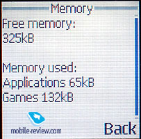 The phone allows to send and receive MMS messages. Up to 150 short messages and 50 graphic messages can be stored in the phone memory. Remaining free space is used to keep MMS messages, Java programs, sounds, ringing tones and graphics. The phone memory is 350 Kb by default. Call lists. Lists of received, dialed and missed calls with a possibility to view date and time. Each list contains up to last 10 phone numbers. There are also cost and duration counters here. Profiles. Nothing extraordinary. Usual possibilities to personalize your phone. All the settings can be activated till the specific time. Settings.You can notify settings for wallpapers (one of the graphic files). Also a user can set a colour scheme of the menu (several schemes are available). ![]()