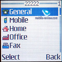Phonebook. The phonebook offers the similar possibilities as Nokia 6610, 6100 and others. You can add up to 3 numbers and 1 text field to each contact. The dynamical memory enables to save up to 5 phone numbers and 4 text fields for each block if you have less than 300 contacts. There are also caller groups here. ![]()