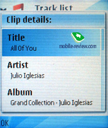 Видеоустройство пишет с весьма посредственным качеством, доступно разрешение 176х144 и 128х96 точек, частота кадров - 15 в секунду. Формат записи - 3GP, можно отключить звук, ограничений по длительности как таковых нет, если не выставить режим для MMS. Напомню, что ровно та же камера записывает видео с разрешением 352х288 точек, хоть и с не очень хорошим качеством. Специальным образом ограничив возможности камеры (отменив те же Сцены и сократив число настроек), разработчики попытались увести Nokia 3250 в другой сегмент – сделать его исключительно музыкальным. Музыкальная часть аппарата ничем особенным не отличается от других смартфонов компании, за исключением выделенных клавиш. Музыкальность определяется не иным звуком, набором настроек, а в первую очередь наушниками, идущими в комплекте, да соответствующим пультом. Внешний вид плеера немного иной, он более привычен для обычных моделей других производителей. В плеере все элементы управления на экране размещены по вертикали, передвигаться между ними можно джойстиком. Перемотка прогрессивная, что является большим плюсом (тут надо использовать именно аппаратные кнопки, джойстик вправо-влево изменяет громкость звука, боковых-то клавиш нет). Раздел Музыкальная библиотека позволяет отобразить все музыкальные композиции, сохраненные в памяти аппарата или на карте, можно их отсортировать по исполнителю, жанру, альбому, композитору. Есть автоматическое обновление библиотеки, когда в нее добавляются все найденные записи. Обидно, но для тех, кто планирует хранить много музыки, не предусмотрено никаких средств для поиска отдельных композиций, только просмотр вручную по соответствующим разделам.