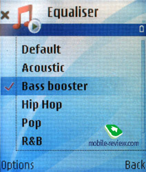 Отдельный пункт меню - Сервис, он предполагает возможность загрузки с сайта компании новых треков, демонстрационных роликов. Насколько это будет востребовано - сложно судить, скорее всего, все-таки пользователи будут использовать загрузку с ПК. Телефон поддерживает следующие музыкальные форматы: eAAC+, AAC+, M4A, MPEG-4 ACC LC, LTP, MP3, AMR-NB, AMR-WB, 64 polyphonic MIDI, RealAudio Voice, RealAudio7, RealAudio8, RealAudio10, WMA. Наиболее интересными выглядят следующие форматы: мр3 (поддерживаются любые битрейты, в том числе и переменный), AAC во всех вариациях (для поклонников и пользователей iTunes), а также активно продвигаемый Microsoft WMA. При наличии встроенного модуля Wi-Fi, как в Nokia N91, поддержка RealAudio пригодилась бы для прослушивания сетевого радио, так же она остается факультативной. Для любого плейлиста поддерживается случайное воспроизведение, повтор всех композиций или одной. Есть ряд преднастроенных эквалайзеров, возможность настройки собственных эквалайзеров. Работа эквалайзеров не очень заметна, нужно настраивать крайние значения, чтобы добиться значимых изменений. Из дополнительных настроек стоит отметить возможность изменения баланса каналов, эффекты реверберации (всего 8 эффектов – аллея; под водой; маленькая, средняя, большая комната; большой холл). Реверберация - исключительно цифровой эффект, причем реализованный не лучшим образом. На заднем фоне музыкальных композиций зачастую слышен цифровой шум, посвистывание. Для каких-то установок реверберации он проявляется сильнее, для каких-то - меньше. Но добавление данной функции - исключительно дань маркетингу, практической ценности в ней - ноль. На компьютере, в играх применение реверберации оправданно, в портативных же устройствах данная функция не слишком интересна.