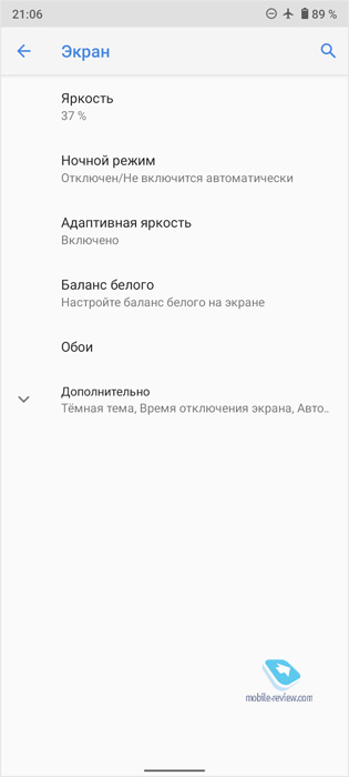 Настройки экрана типичны. При подключении к зарядке смартфон предлагает транслировать заставку (на скриншотах ниже это черный экран с часами). Можно менять размер шрифтов, настраивать переход на темную тему.