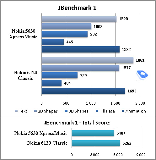 The top speed you can get with the 5630's Bluetooth connection is around 100 Kb/s. We also tested its A2DP profile in pair with the Sony Ericsson DS970 headset, which worked just fine - we managed our play list, skipped within tracks and adjusted volume seamlessly, however we couldn't make current track's title show up on the headset’s display. Back to the table of contents >>> PerformanceAs a proof of our earlier statement about the phone’s performance we offer you the results of Jbenchmark tests for the 5630 XpressMusic and a couple of diagrams showing how it stacks up against the Nokia 6120 Classic. ![]() ![]() ![]() ![]() Back to the table of contents >>> SoftwareYou can learn more about the phone’s software department from our dedicated review.