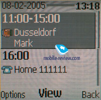 Organizer. You may keep from 100 to 250 entries in the memory and everything depends on their length, there is an automatic erasing of the old entries (by the time characteristic). There is a month and week view of the calendar, the last view has a division into hours, there is a quick switch to an entered date. There is a possibility to enter up to 5 different events (meeting, call, birthday, reminder, memo). A notification may be assigned to an event, they may be recurrent. ![]()