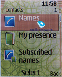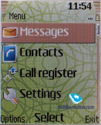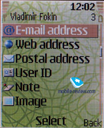 The localization is rather good, abbreviations are almost absent. Predictive text input T9 is realized for both Russian and English. About 3 MB of memory are dynamically distributed among the applications. Phonebook. The phone memory can contain about 500 contacts; however, the number can reduce at the maximum possible numbers entered for each contact. About 5 numbers can be bound to a name, each allows selecting a type (mobile, work, home, fax). Besides, about 5 extra fields can be filled for each contact - e-mail address, post address, PTT, WEB, or a text note. A picture or a photo can be assigned to a contact; finally, you can create a tag for voice dialing.