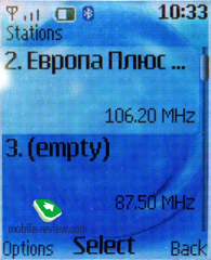 Радио. Аппарат позволяет запомнить до 20 FM-радиостанций, назначить им текстовые имена. Данная функция аналогична другим аппаратам от Nokia, переключение сохраненных радиостанций возможно по нажатию клавиши на гарнитуре. Радио может проигрываться в режиме громкой связи, но необходимо подключение гарнитуры, она играет роль антенны. Сигнал радио может играть роль будильника, но также необходима гарнитура. Возможности записи радиопередач нет.
