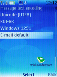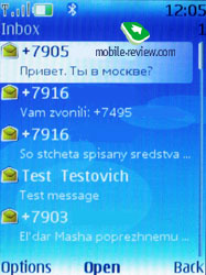 In the general list of entries groups are displayed in one raw with single entries, but marked with their own icons. Search is executed in both group names and stand alone contacts at the same time. This arrangement can be confusing for the first time, but later on you realize all the advantages, as you don’t have to look up for a special item on the menu to access the groups list (besides, it’s accessible only from the main menu, using the soft-key or shortcut numbers, you’ll get to the list itself without any options). Search in the general list can be executed by entering several letters – it doesn’t cause any nuisances and works as it always does. Pressing the “*” button results in fast switching to entries on a foreign language (in case you have contacts in both Russian and English languages for example). When browsing the phonebook, pushing “#” key calls up detailed view featuring the general number – to access full data on a contact use the corresponding menu (two presses). All entries may be sorted either by first or last names. MS Outlook synch module of the 6131 is far more tuned than that found on the earlier models. Most of the fields synchronize correctly – this goes for First Name and Last Name fields as well. From the phonebook menu you are at liberty to send any entry as a Business Card to another device with the aid of a SMS, MMS or a wireless protocol. At a glance there is no way for sending the entire phonebook off – even if you select all contacts, the context menu won’t offer the corresponding item. However using Settings – Connectivity – Data transfer tab it is more than just possible, the handset supports synchronization (add all, replace all), apart from contact list you can transfer notes and calendar events. Messages. You can always change input language while typing in any menu, this solution is identical to the one applied on Nokia smartphones and is quite handy.
