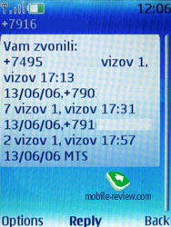 As for codings for Russian languages, there are a couple of them, by default it is standard Windows 1251. You can also take advantage of picking personal coding for any message (UTF8, KOI-8R, Windows 1251), that’s very useful, no doubt of that. The client ensures support for any attachment types; on top of that you can browse handset’s storage right from this application. Settings of incoming and outgoing mail are separated from each other. You can cap the amount of received messages (not more than 150), retrieve only headlines of letters, and delete messages from the server once uploading to the phone has been completed. Any received message cannot exceed 300 Kb in size, which is too little for majority of consumers. But if you turn a blind eye to that, the client looks very promising, at least the way it is developing in makes it more capable with every released version. Call logs. There are three lists in the phone. Each list may contain up to 20 entries. It might seem pretty standard, but the best thing about the logs is that date and time of a call are displayed in the list outright. Pressing the Call button in the standby mode will call up the list of last dialed numbers. That is inconvenient sometimes and majority of this handset’s rivals have either a merged list or provide fast switching from one list to another. Here you need to remember where the necessary number is, in which list and then choose it, which is not so comfortable. General call log can be accessed only from the main menu; as a rule that requires not less than 3 presses – it might prove unhandy in certain circumstances as we do make calls, but receive a lot of them too.
