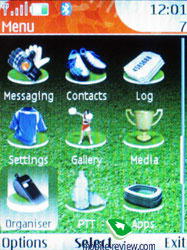 Once the display falls into standby mode, it gets taken up by clock, missed calls and received messages indicators – all these events are tied up with a tiny icons and numbers, i.e. if you have 3 missed calls, you will see a corresponding icon and “3”. The main menu can be represented in one of the four ways: list (5 items of the main menu are shown), grid (12 icons), grid with labels (9 icons), and tabs. The first three types are well known for being embedded in the previous models, while the last one is of a certain interest. The top of the screen holds toolbar containing menu items and corresponding notes. You can use horizontal deviations to move throughout the menu – contents of a highlighted item are shown in a vertical line. It’s worth noting, with this lay-out navigation gets easier, as you see all available menu options.