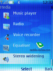 Stereo Widening – allows extending the base. The effect is dependant on hardware specifications. The dictaphone observes the limit of 60 minutes per one recording and is enabled during calls. The user is free to choose storage place (either phone memory or memory card), but can’t set titles of his own – the handset strictly defines them as label and number. Unlike handsets by other manufacturers a recording’s title here doesn’t feature the telephone number of your interlocutor and that’s quite frustrating.