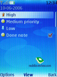 By pressing numeric keys you can switch between saved radio stations – in other words it’s a kind of fast navigation feature. Organizer. You can submit up to 1000 entries, though the final number strongly depends on length of each note; automatic cleaning up is onboard (time-wise). Monthly, weekly (with hourly grid) views are available in the Calendar. The handset offers five various types of events: meeting, call, birthday, memo, and note. Each event regardless of its type can have an alert configured, and be recurrent. While in monthly view the bottom area features up to three appointments for a selected day.