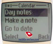 Settings. This menu item allows to choose a menu language, set date and time, and time and date correction according to network settings (operator dependable function). One can also set a simple alarm-clock here (only once). It can alert even when the phone is switched off. Other settings, connected with the phone, are also can be found here (GPRS settings in particular). Games. There are 4 pre-installed games in the phone: Snake II, Pairs II, Space Impact and Bumper. Nokia’s phones users have already acquainted with them. There is a possibility to use games-service, but you should register at Nokia’s site and receive a special ID to do it. Calculator. It’s standard, so, no comments. To-do list. One can record up to 30 points here and give a small note (up to 50 characters) to each one. Then, you can set a priority level (high, low, standard). It’s very convenient that a record from to-do list can be moved to a calendar to a special date. Calendar. One can view a month calendar here and record current events. The phone enables to store 100-250 calendar records, it depends on their text length. A reminder (date and time) can be set to each record. It’s also possible to set a time, during which they will be kept, after this period they would be automatically deleted.