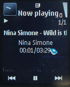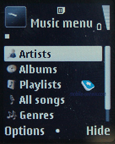 Back to the table of contents >>> Cover UIEver since their first clamshell-styled phone Nokia have been trying to squeeze the maximum from the outer display. The 6650 Fold, much like the 6290/N76, features a 22x28 mm (1.36") external TFT screen with a resolution of 128x160 pixels and capable of 262 K colors. It remains readable under direct sunlight and can accommodate up to 6 text and 2 service lines. At the standby screen you can see all service indicators along with current time and the Menu icon. The middle button acts as a shortcut to the application list, topped by the music player by default: pressing the left key selects playlists grouped by artist and genre. To navigate through the list you'll need to use the side-mounted volume control key, which is quite intuitive and probably won't cause any hardships.