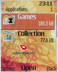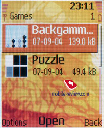 Applications. All the preset Java-applications are here, also games. Two games are preset, they are Backgammon and Puzzle. The only one preinstalled application is converter of clothes size for various countries.