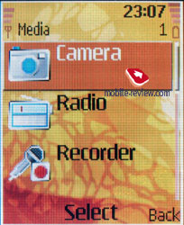 Media. In this part all the settings connected with multimedia capabilities of the device are gathered, let's start considering them with the Camera. The integrated camera allows to take photos with VGA resolution and in the portrait mode (80x96 pixels). The quality of the pictures on the screen is average. After transmitting them on a PC they do not get worse but still not very good. The settings of the camera are ascetic, there is a night shooting mode, three types of quality and compression levels. The files are stored as JPG.