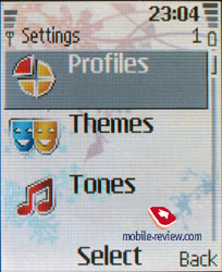 MenuPressing the central button, you can call the menu. The main menu is represented with rows of icons. And up to 9 icons feat the display simultaneously, however, having more than 9 icons (for instance, with SIM-Menu), you can use scrolling and scroll the display down.