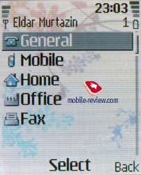 Phonebook. Up to 1000 names, which is the maximum possible number, can be saved into the phone's memory. Only keeping little data for a name (only - two fields filled), you will reach it. With average filling, I mean about 6-7 fields per a name; you will have a chance to store about 300 entries, not more. As you may have already guessed, up to five phone numbers can be assigned to a name, also you can select a type of the number (main, mobile, home, office, fax). The first entered number becomes a default one and can be then edited to your liking. When entering data for the first time, you can keep only one main number, and all other actions are taken later from the editing menu. One will find this way of entering data inconvenient, however, some of you will say that keep only one number for a name. Both will be right, and considering that all Nokia phones come with such realization of a phonebook, it should cause no problems.