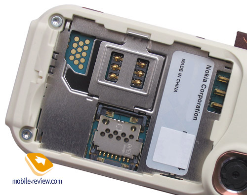 Задняя часть верхней половинки имеет металлическую пластину, она защищает дисплей от механических воздействий, когда аппарат раскрыт. Решение любопытное, да и с позиции дизайна интересное. Вообще комбинация различных материалов – это конек компании Nokia в последнее время. Так, задняя крышка, прикрывающая аккумуляторный отсек, выполнена под кожу, имеет характерное тиснение. Наличие бирки на боковой стороне привносит определенный шарм в эту модель.