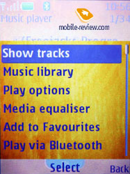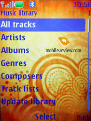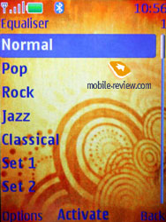 The display offers information on current track, album and artist. The navigation pad is bound up with standard functions (track switch, rewind, and stop). Progressive rewind feature is missing on the 7390 – you can fast-forward tracks at standard 5 sec. pitch, which is completely out of use with big files (audio-books or something like that). Playback may be random or sequential, Repeat mode works for both all tracks and individual files. Outside the player’s application you will find Stereo Widening feature, which is, frankly speaking, pretty crude, while equalizers do have an impact on sounding quality. There are five presets (Normal, Pop, Rock, Jazz, Classical) for the five-band equalizer found on the 5300, and two user-customizable ones. The music library contains the following filter tabs: