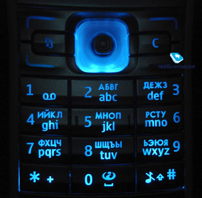 Подсветка клавиатуры синего цвета, достаточно равномерная в области цифровых клавиш, в то же время функциональные клавиши подсвечены слабее, а кнопка отбоя вызова не подсвечивается вообще.