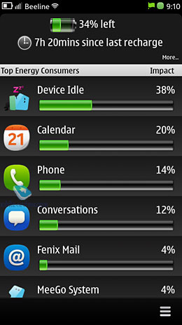 The phone features a battery saving mode that can be automatically enabled when the battery reaches a certain depletion level. It is a nice feature to have although it is not quite clear what is done when it’s active – it turns down the brightness level but it surely must do something else. ![]() One of the strongest sides of this phone and the MeeGo platform is the battery life. The phone can easily give you two days on battery and it is quite an achievement as compared to Android smartphones and it is pretty comparable to iPhone’s battery life. However, some apps dramatically increase power consumption especially some of those that work on the background. I am not sure whether the reason is the apps themselves or the phone’s settings. But you should keep in mind that certain applications can kill the battery very quickly so if you are not happy with the battery life time you’d better check the apps you have been using lately. Some users reported the charging indicator issues – it does is not flashing during charging and does not lit when the battery is fully charged. Here’s the discussion of this problem on the Nokia website. Nokia’s service centers do not yet have a description of this issue and it remains unclear what causes the indicator to go rogue, sometimes the issues goes away on its own. Anyway, the problem is not that big. Back to the table of contents >>> Memory and StorageThe phone is available in two variants with 16 or 64 GB of storage on board and neither of them has a memory card slot. The storage distribution of the 64 GB version is as follows: 4.2 GB is reserved for apps (2GB already occupied out-of-box), app data – 2.1 GB, user data 57.7 GB. The figures for the 16 GB (15.79 GB) version: 4.2GB for apps (2GB already occupied), app data – 2.1 GB, user data – 9.5 GB. ![]() The phone features 1GB of system memory. However, different OS require different amount of memory for the same tasks so it all really depends on the system memory requirements in the end and a direct comparison of memory size would be irrelevant. The manufacturer boasts of the most advanced multitasking ever in Nokia N9 mostly thanks to the hefty 1GB of system memory. Active apps are never force closed and they take up very little system memory (at least the standard apps do). I admit I am impressed by the phone’s multitasking as far as the bundled apps are concerned: you can view the icon list of all the active apps – Nokia says the phone supports up to 70 active apps and other processes. And they all work fine except when you have a dozen of active apps it gets tricky to navigate in the active apps menu and that’s where some issues lie. The OS apparently does not have an auto memory clearing feature – to be precise there is one but it only works when the phone is experiencing serious issues. In the settings you can enable app shut down by pulling the screen down since by default apps are always only minimized and it is a big disadvantage. For example, if you watch a non-converted video and then open an MS Word document the phone will be lagging heavily and might even reboot. On the video for this review you can see what I am talking about and it can happen any time. Both Android and iOS have system features for this reason that don’t require any user activity – the OS decided on its own which app to stop and N9 cannot do that which is a real downer. Some reader who saw how many apps were running in my N9 commented angrily that it was not a fair comparison but they seemed to have forgotten that other OS do the job automatically. Users should not worry about how many apps are running at the moment and which ones they should close – the device should be working for users not vice versa. The phone uses a single core 1GHz ARM Cortex A8 TI OMAP 3630 CPU and the PowerVR SGX530 graphical accelerator. The pone is quite fast and only lags when you really push it. I think its performance is comparable to current top Androids like Samsung Galaxy S and Sony Ericsson Arc. However, it is not as fast as the dual core smartphones and it is apparent when you scroll through menus – video rendering is not as fast but, all in all, its performance will satisfy most users. Back to the table of contents >>> Connectivity. Bluetooth, USB, WiFi, NFCUSB. There are three USB modes: