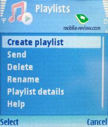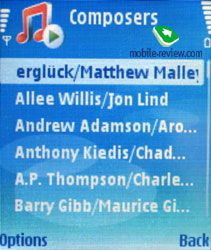 Компоненты Nokia N91 отвечающие за аудиочасть подобраны очень хорошо, звук, который воспроизводит телефон очень чистый, имеет насыщенный диапазон. По этому параметру телефон является одним из лидеров и разделяет пальму первенства с Sony Ericsson W950i. На мой вкус, победителем по качеству звучания выходит именно продукт от Nokia, звук здесь лучше. В тестовой группе, однако, мнения распределились примерно поровну. Это еще раз говорит о том, что восприятие музыки исключительно субъективная материя и слушать надо самостоятельно. Если проводить параллели с цифровыми плеерами, то звук в Nokia N91 вполне можно сравнить с такими аппаратами, как iPod Nano, iPod Mini, аналогичными плеерами других производителей. От описания клавиш и впечатлений от звука стоит перейти к программным настройкам. Отмечу, что аппарат поддерживает следующие музыкальные форматы - MP3, AAC, AAC+, eAAC+, Real, WAV, WMA, M4A, AMR-WB, True Tones, AMR-NB. Для мр3 композиций битрейт может быть переменным, проблем с этим нет. В целом на диск помещается порядка 900-1000 композиций различной длины с битрейтом не ниже 192 Кбит/с. Этого вполне хватит, чтобы наслаждаться музыкой около 2 дней непрерывного прослушивания. Программно плеер напоминает таковой в других продуктах от Nokia, но есть и ряд отличий. При входе в музыкальное меню вы видите список, состоящий из следующих пунктов: