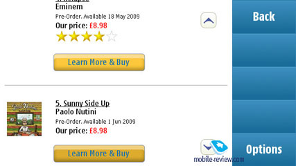 ![]() ![]() ![]() ![]() ![]() ![]() ![]() ![]() ![]() ![]() ![]() Время сохранения снимка в любом из разрешений примерно одинаково, это около 3-4 секунд, если вы выставили просмотр снимка после съемки. Либо 1-2 секунды, если вы готовы снимать сразу дальше (во втором случае снимки записываются из буфера, благо тут же реализован режим серийной съемки). Различные цветовые режимы. Учитывая, что подобные эффекты можно применить к любому снимку в обычном графическом редакторе и на самом аппарате после съемки, использовать их изначально не стоит. Всего есть 4 эффекта – Sepia, Black&White, Vivid, Negative. Корректировка экспозиции. Шаг корректировки – 0.33, функция будет полезна при съемке объектов с преобладанием светлого или черного цвета. Баланс белого. В автоматическом режиме камера работает нормально, но есть возможность также выставить Sunny, Cloudy, Incandescent, Fluorescent. Сравнение с Nokia N85: Запись видео. При записи видео число настроек значительно меньше, чем в режиме фотографирования. Присутствует программный стабилизатор картинки. Баланс белого – автоматический, солнце, облачно, Incandescent, Fluorescent. В качестве эффектов можно использовать Sepia, Black&White, Negative. Режим съемки – только автомат и ночной. Максимальное разрешение – 640х480 точек, при этом формат – mpeg4, возможно отключить запись звука (регулировки качества кодирования нет, всегда 30 кадров в секунду). Общее время записи ограничено только свободным местом. В максимальном разрешении цифровой зум х4, при QCIF – уже х8 (тут формат записи 3GP). Звук пишется в стерео. ![]() ![]() ![]() Музыкальные возможностиПочти полная копия Nokia 5800 XpressMusic, но используется другой чип для обработки музыки. За счет него возросло время работы, до 35-36 часов прослушивания музыки. Сегодня это абсолютный рекорд на рынке. Качество воспроизведения лучше, чем в Nokia 5800, хотя по памяти разница не ощущается. Стоит взять два аппарата и послушать их одновременно, окажется, что в Nokia N97 звук более живой, насыщенный, голоса звучат громче и естественнее. У меня не было возможности сравнить аппарат с Nokia N91, который стал эталоном по качеству звучания, но послушав его с различными моделями из текущей линейки, могу говорить о наилучшем качестве воспроизведения. Даже по сравнению с музыкальными моделями. Второй моделью, в которой используется аналогичное аппаратное решение, станет Nokia 5900, но появится она только в конце года. Список поддерживаемых форматов: AAC, AAC+, eAAC, eAAC+, MP3, MP4, M4A, WMA, Mobile XMF, SP-MIDI, AMR (NB-AMR), MIDI Tones (poly 64), RealAudio 7,8,10, True tones (WB-AMR), WAV. Для mp3-файлов поддерживаются различные битрейты, в том числе VBR. При синхронизации с Windows Media Player 11 и последующих версий возможно использование защищенных DRM-файлов (Janus DRM). Название композиции и автор отображаются на экране, как и управляющие элементы. Перемотка прогрессивная, в том числе ползунком на экране можно перескакивать в нужное место композиции. ![]() ![]() ![]() ![]() Эквалайзеры. Качество звука при смене эквалайзеров также заметно изменяется. Каждый эквалайзер 8-полосный, предустановлено их 6, каждый можно отредактировать по своему усмотрению, кроме звучания по умолчанию. Вот список эквалайзеров: Bass Booster, Classical, Jazz, Pop, Rock. В настройках звука также можно выбрать баланс каналов, расширение стереобазы (StereoWidening) плюс Loudness. ![]() В аппарате есть функция случайного воспроизведения, а также повтора всех композиций или выбранной. В режиме ожидания на экране отображается информация о пр