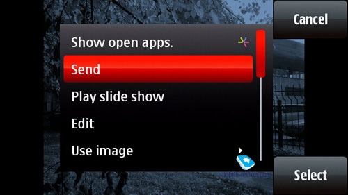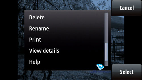 ![]() Музыкальный магазин – доступ к Nokia Music Store, возможно покупать песни, альбомы, загружать их на свое устройство. ![]() ГалереяОчень напоминает соответствующее приложение в старых аппаратах, есть деление на фотографии и видео, песни, записи диктофона, другие файлы. При просмотре фотографий показываются миниатюры, выбираете ее - всплывает подсказка с именем файла. Двойной щелчок - открытие файла. Функция слайд-шоу очень простая, никакой музыки, просто пролистывание файлов. Поддерживается как вертикальная, так и горизонтальная ориентация. Зуммирование за счет нарисованной линейки работает быстро для небольших файлов. Далее увеличенную картинку можно перемещать по экрану пальцем. Любой файл можно загрузить в сеть с помощью сервиса OVI. Есть встроенный редактор изображений, он позволяет добавлять текст, клип-арты, рожицы, применять различные эффекты, изменять размер фотографий и картинок.