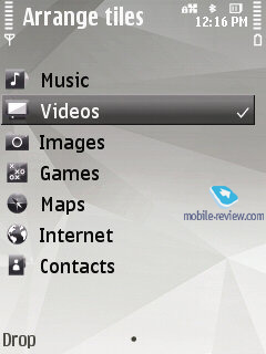 Хранитель экрана или обои. Пользователь может выбрать любой набор изображений, и тогда они будут в режиме слайд-шоу меняться на экране, как для хранителя, так и для обоев. Анимация меню. При переходе от одного меню к другому используются анимационные эффекты. Это может быть снег, когда снежинки крутятся на экране, либо просто пролистывание страниц. Анимационные эффекты включаются в темах оформления, пользователь не может выбрать какой-то конкретный эффект для отдельного меню самостоятельно, но это вряд ли и нужно. На первых моделях применяемые эффекты просты, они практически незаметны. Анимированные иконки. Для главного меню можно включить анимированные иконки, тогда все пункты меню будут интереснее визуально. Анимация зависит от выбранной темы меню, а также от аппарата. Организация меню. Неоднократно мы упоминали о том, что разбиение пунктов по разным разделам меню в различных моделях лишено логики, не систематично. Если в одном телефоне пункт Календарь находится в офисных приложениях, то в другом его можно найти где-то еще. Подобных примеров множество, и пользователь, знакомый с одним продуктом на S60, был вынужден менять свои привычки, искать знакомые пункты меню по всему меню. Здесь приняли за правило, что в главном меню не может быть более 12 иконок (матрица 3х4). Деление функций по пунктам сделано лучше, но все равно порой логика страдает. Например, в Nokia N78 офисные приложения перенесены в раздел Installations, где искать их по умолчанию никто не сообразит. В этом аспекте компании есть над чем работать, это долгий процесс. Представление главного меню по умолчанию в виде матрицы, также возможно отображение списком, а также два карусельных меню (Horseshoe, V-shaped).