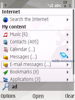 Видео, search 4.0 (22,9 мб, mpg) >>> Вам достаточно набрать первые буквы слова, и телефон сразу же покажет, сколько вхождений есть для каждого из разделов, можно просмотреть отдельно каждую категорию. Это удобно. В настоящий момент нечто подобное есть только на телефонах Samsung, но на них поиск организован проще, хотя возможности и сравнимы.