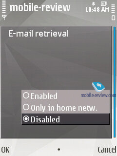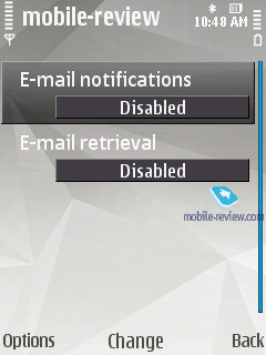 Помимо стандартных коротких сообщений вы можете отправить/принять свою почту (POP3/IMAP4/SMTP/MIME2). Создавать шаблоны можно для любых сообщений, для SMS 10 шаблонов уже предустановлено. При создании сообщений электронной почты пользователь может выбрать, будут ли отображаться такие поля, как Subject, Cc, Bcc (выбор доступен для каждого поля). Дополнительно появилось поле приоритета (Low, Normal, High). Важным улучшением почтового клиента выглядит возможность присоединять к телу письма файлы любого формата, в том числе и не поддерживаемого самим устройством. Доступен автоматический мониторинг до двух почтовых ящиков на предмет новых сообщений, пользователь может установить интервал опроса (день, время). Можно установить, будет ли почта получаться автоматически целиком, либо загружаться будет только часть сообщения (указывается ограничение в Кб), либо только заголовок. Поддерживается технология Push Mail (только с применением IMAP IDLE).
