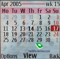 Organizer. You can enter from 100 to 250 entries depending on their length; old entries are automatically deleted (on the basis of the time period). Calendar view monthly, weekly with division for hours, fast switch to the selected date. Up to 5 various events are supported (meeting, call, birthday, memo, note), a reminder may be assigned to any event which may be also recurrent. A to-do list allows keeping events with three types of priority (high, normal and low), setting a critical date for the event.