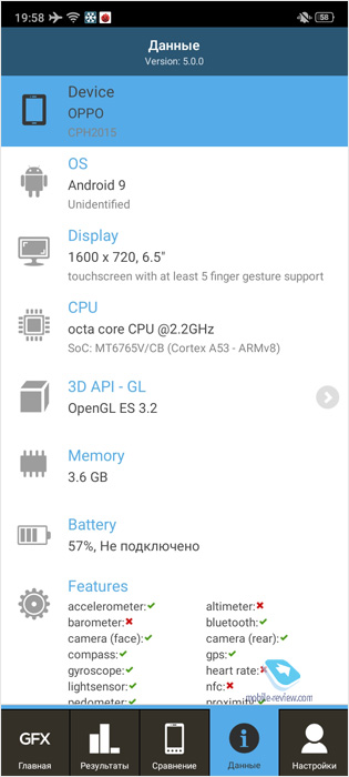 Загибы у экрана отсутствуют, есть среднего качества олеофобное покрытие. Для защиты глаз и фильтрации синего свечения доступен ночной режим, после его активации изображение приобретет желтоватый оттенок, есть возможность и здесь подредактировать холодный или тёплый спектр. Датчик освещения работает хорошо, как и режим автоматической подстройки яркости под окружающие условия. Изображение, несмотря на сравнительно небольшое разрешение экрана, не раздражает отсутствием чёткости, текст и картинки отображаются адекватно. На дисплей наклеена заводская плёнка, на первое время подойдёт, особенно если вы привыкли к такой защите экрана своего смартфона. АккумуляторСочетание ёмкого аккумулятора и разрешения HD+ в смартфоне всегда делает автономность одним из позитивных аспектов пользовательского опыта. Oppo A31 не стал исключением. При использовании смартфона в качестве основного аппарата для переписки в нескольких мессенджерах, синхронизации в двух почтовых аккаунтах, частого прослушивания музыки посредством потоковых сервисов и периодического просмотра YouTube он вытянет двое суток при 4 – 4,5 часах работы экрана ежедневно. Тест на циклическое воспроизведение тестового видеофайла в формате Full HD показал результат в 26 часов до полной разрядки, ожидаемый неплохой результат. Полностью зарядить аккумулятор получится за 130 минут, быстрой зарядки нет, как и возможности обратной зарядки других гаджетов по проводу. В принципе, этого и не стоило ожидать от гаджета с Micro-USB. Память, чипсет и производительностьOppo A31 работает на процессоре MediaTek Helio P35, в целом он подходит для нетребовательных задач и игр. Базовая частота ядер на бумаге выглядит совсем неплохо, их производительности уверенно хватает для более-менее плавной работы интерфейса смартфона как при пролистывании рабочих столов, так и при переключении между приложениями, при этом скорость перехода невелика. Постоянная память смартфона выполнена по технологии eMMC 5.1, так что предельных скоростей обработки информации ожидать не приходится. Доступно расширение внутренней памяти при помощи карт памяти microSD, поддерживаются карточки до 256 ГБ. Скорость оперативной памяти и показатели бенчмарков – на скриншотах ниже.