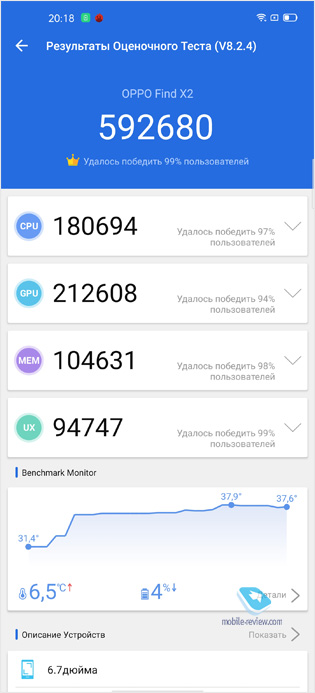 В бенчмарке Antutu смартфон Oppo Find X2 (QHD+, 120 Гц) набирает почти 600 000 баллов. Нагрев был с 31 до 37 градусов.