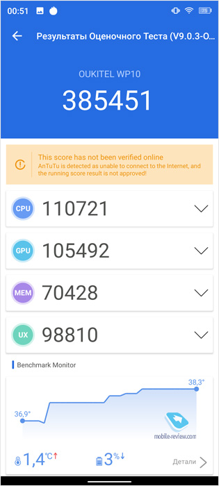В тесте Antutu смартфон набирает почти 400 000 баллов – это приличный результат.