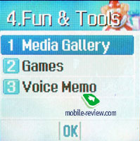 Fun and Tools. "Media Gallery" item holds folders with preinstalled and user uploaded images and melodies. Free and used memory capacity may be seen here.
