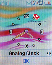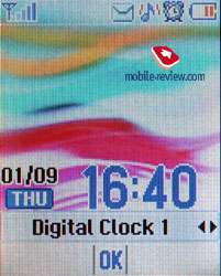 Settings. This holds everything concerned with the phone, network, internal and external screens, and other settings. One of the three preset images (one of them is animated) and any image uploaded by the user can be assigned as wallpaper. One of the offered three variants of clock and calendar displaying is to be chosen for the main screen. The backlight time runs from 5 seconds to 1 minute (8 levels).