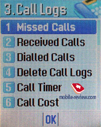 Call lists. Here you can view the information of dialled, received and missed calls. The equal numbers are not combined and are shown one by one. Call duration is viewable from this very menu.