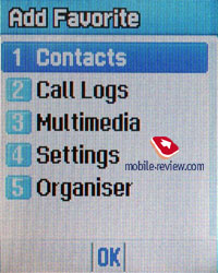 There is an offer of 5 adjustable call profiles. A call type can be vibra, signal, progressive signal, vibra and signal together and first vibra and then signal. You can use MP3 files as a call melody, but their size shouldn't exceed 300 KB. There is also a menu 'Favourites' - this is the user's own menu for a quick access to frequently used functions. In standby mode you get here by pressing left on the navi pad.