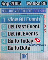 Calendar. A view of either a whole month or the all event list is possible. An event has a mark (birthday, meeting, trip etc.), time, a text note, an alert or an activation time (in time or in a period from 15 minutes to 1 day before the event). You can also determine an event repetition - once, every month or every year. There is a limitation of 50 messages in all.