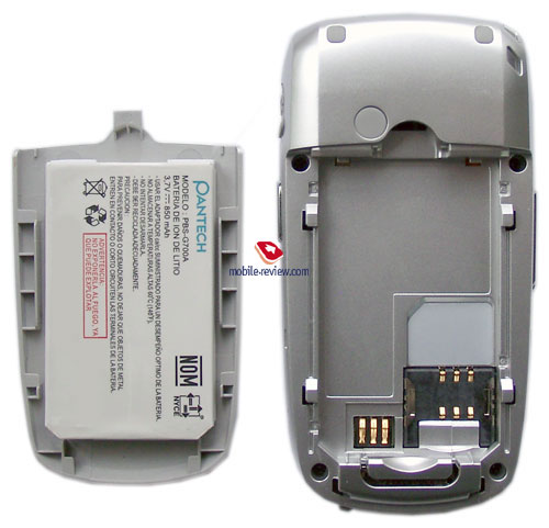 A battery cover occupies almost the whole back surface. The battery clamp is reliable with no backlash. The battery supplied with the phone is an 850mAh Li-Ion. In the condition of Moscow MTS network the handset worked for 3 days with 15-20 minutes of calls a day and up to 20 minutes of using other functions. That is quite an acceptable battery life. Full charge takes two hours approximately. .