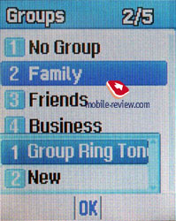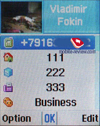 Phonebook. The device holds up to 800 numbers. Entries are shown both separately from the phone memory or SIM-card and altogether. Each entry can have name, up to four numbers, and e-mail. Moreover you may assign a ring tone, a photo or a video to show at a call and put into one of ten caller groups. One can either use 4 existed groups or create a new one. Any group can have a name of up to 19 characters and a ring tone.