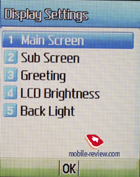 Установки. Здесь находится все, что связано с настройками телефона и сети, дисплея, звука и тому подобного. В качестве обоев для дисплея можно выбрать одну из предустановленных картинок или анимаций, а также установить любую другую картинку из загруженных пользователем или сделанных камерой. Для экрана предлагается выбрать один из предложенных вариантов отображения часов и календаря. Можно выбрать время подсветки в интервале от 5 секунд до 10 минут и настроить яркость.